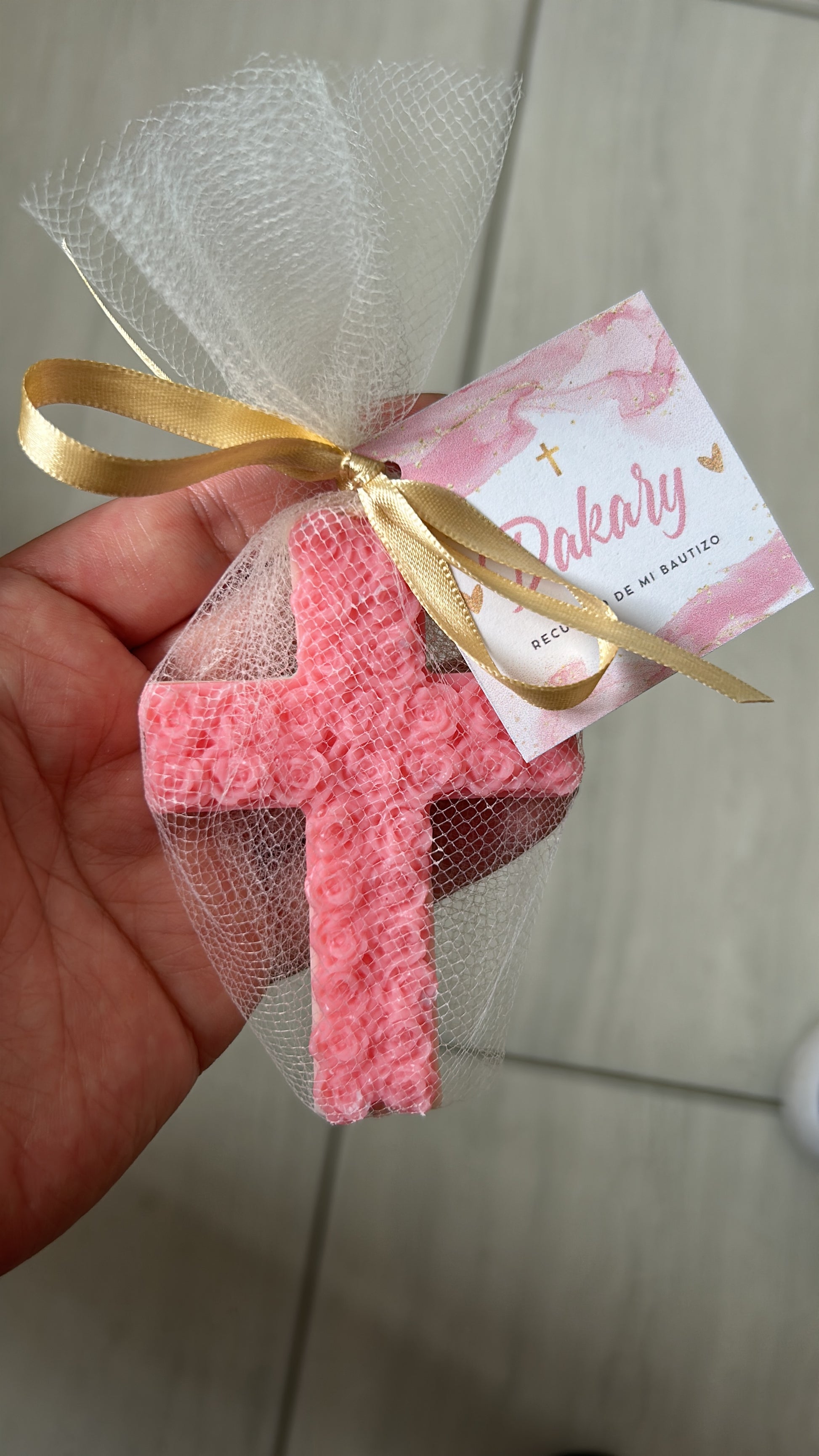 Envoltura: tul, listón y tarjeta personalizada. Se puede elegir bolsa de organza o cajita con costo adicional.
