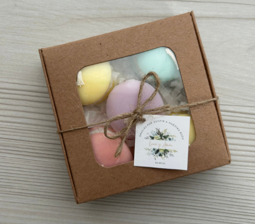 Envoltura: tul, listón y tarjeta personalizada. Se puede elegir bolsa de organza o cajita con costo adicional.
