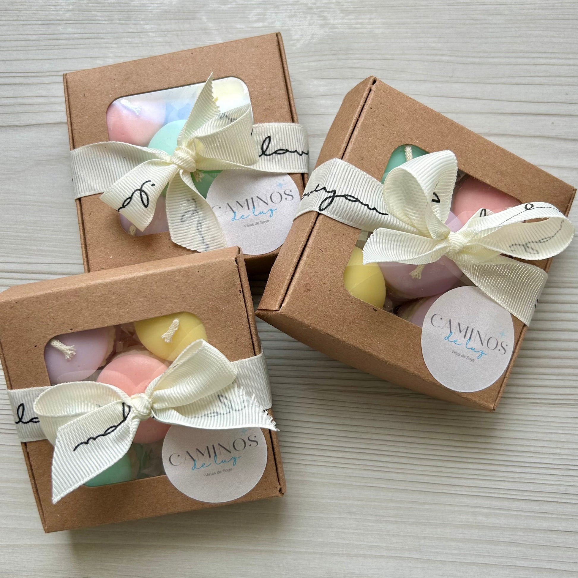 Envoltura: caja de cartón con ventana y listón, con sticker personalizado o tarjeta personalizada.