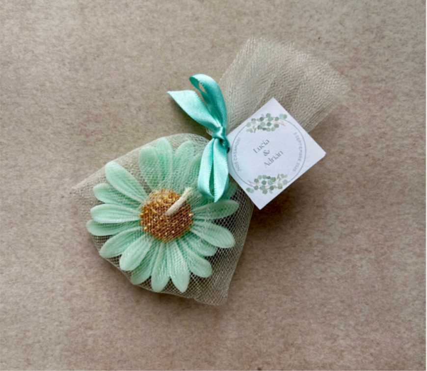 Envoltura: tul, listón y tarjeta personalizada. Se puede elegir bolsa de organza o cajita con costo adicional.