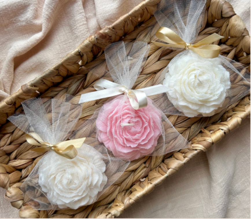 Envoltura: tul, listón y tarjeta personalizada. Se puede elegir bolsa de organza o cajita con costo adicional.