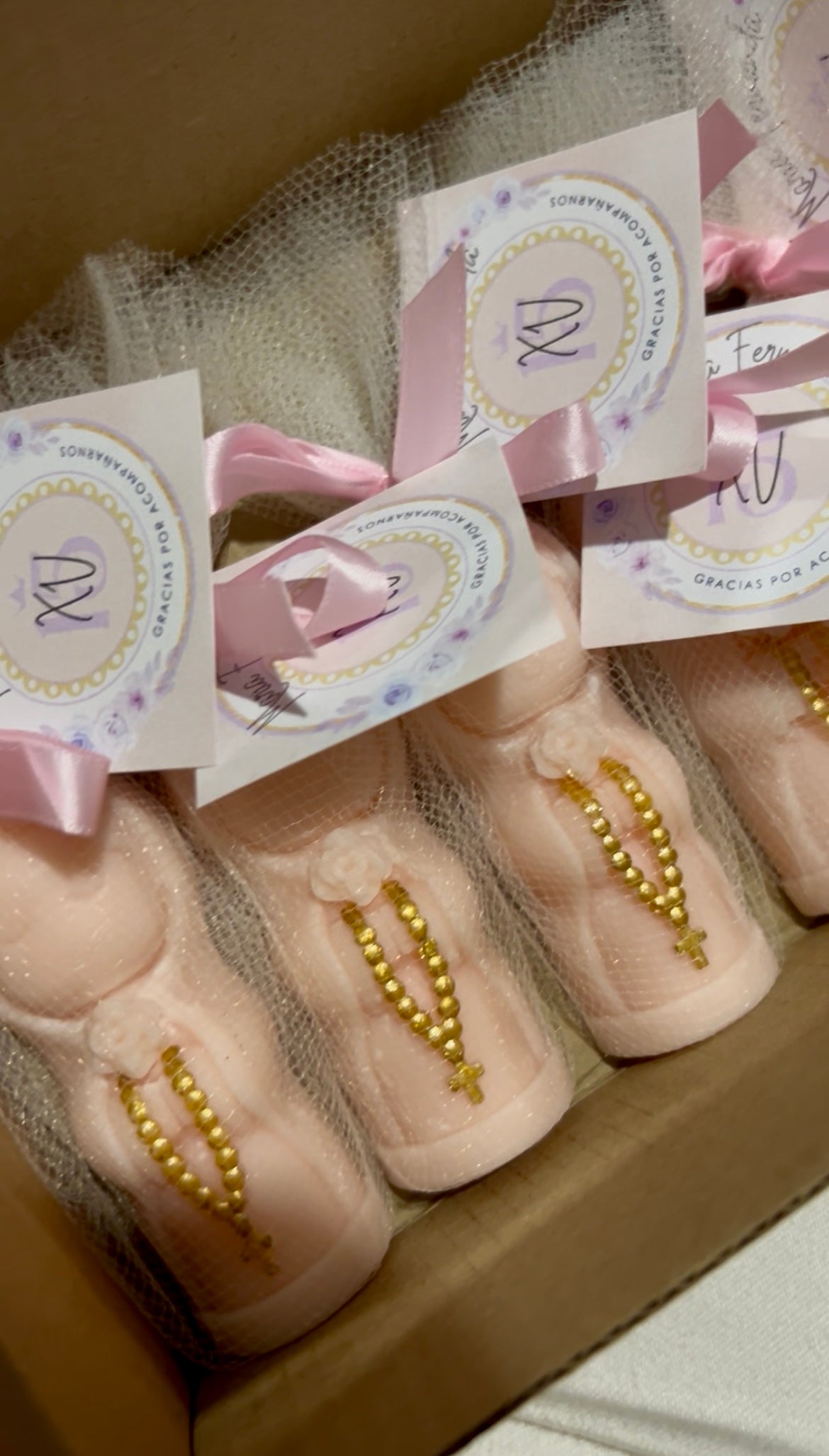 Envoltura: tul, listón y tarjeta personalizada. Se puede elegir bolsa de organza o cajita con costo adicional.